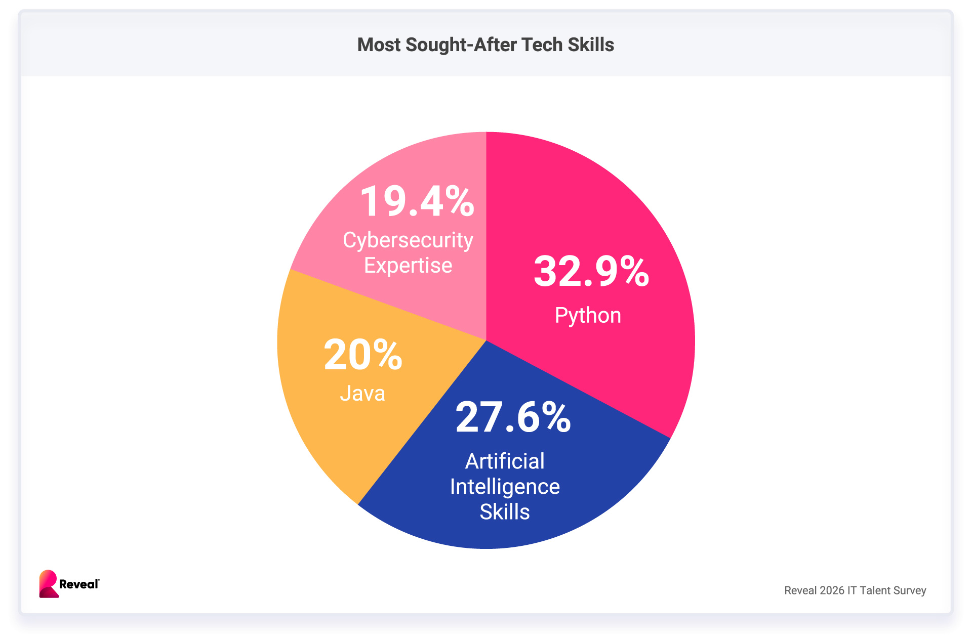 Beyond specific roles, the Reveal survey identifies the technical skills most in demand across organizations. Python ranks highest, cited by 56% of respondents, reflecting its central role in AI development, automation, and data science. Artificial intelligence and machine learning skills follow at 47%, while Java (34%) and cybersecurity expertise (33%) remain widely sought after. Competition for highly skilled professionals continues to intensify.